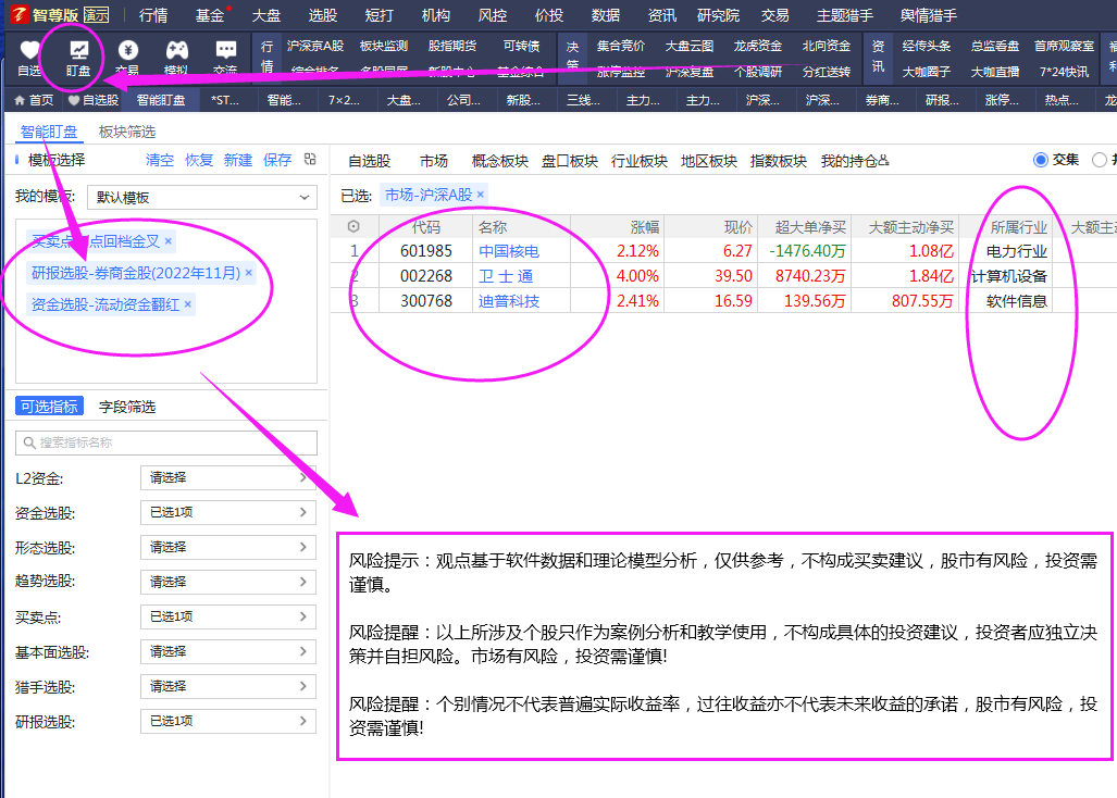那么符合 买卖点-B点回档金叉 + 研报选股-券商金股 + 资金选股-流动资金翻红 的个股如上图所示有: 中国核电,卫士通,迪普科技(风险提醒:以上所涉及个股只作为案例分析和教学使用,不构成具体的投资建议,投资者应独立决策并自担风险。市场有风险,投资需谨慎!)